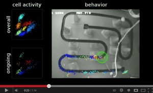 Place cell video from Matt Wilson's lab. Current techniques permit recordings of 10s of neurons simultaneously. Perhaps up to 100. In the video spikes are colored dots, each place cell is a different color. (click on image to go to youtube)