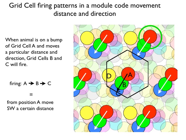 Modular Organization of Grid Cells Within a local regions of entorhinal cortex all grid cells have the same bump spacing (scale) and orientation (angle of the rows and columns), but differ in bump placement.The local regions are called 'modules'. One can think of all of the cells in module sharing a single bump pattern that can be moved horizontally or vertically, with a different x- y- offset for each cell. This means that as the rat moves, different grid cells in the module are excited. The distance and direction of movement determines the specific sequence of grid cells that will fire. Conversely, the sequence of activated grid cells signals speed, distance and direction of movement. This is thought to be the grid cell code. The figure below illustrates. Each set of colored circles represents the firing pattern of one grid cell. Notice the hexagonal arrangement for the circles of any one color. All illustrated cells are in single module. Now imagine the rat is at sitting at a location of one of the bumps for grid cell A. Now it moves south-west a certain distance. Grid cells B and C will fire. This identical firing pattern will occur whenever the rat is at position A and moves SW, In other words, Firing A, B, C codes movement from A southwest, independent of which A bump we start with. The output of a grid cell modules codes movement distance and direction.