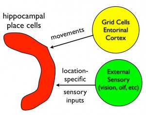 The emerging idea is as follows. Hippocampal place cells behave as a navigator on the ocean, updating the estimate of location using two types of inputs: dead reckoning and sightings. The grid cell system described above is thought to provide the path integration (dead reckoning) input. Other pathways into the hippocampus (probably lateral entorhinal cortex) convey sensory information for "sighting". The collection of hippocampal place cells combine both types of inputs to create a map. Map processing identifies familiar locations and computes efficient paths to other locations.